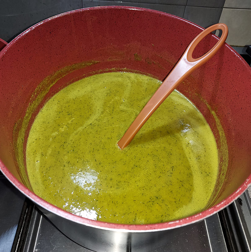 - Apoi, se adaugă amestecul blenduit în aprox. ½ din supa rezultată de la fierberea legumelor și se mai dă într-un clocot încă aprox 5 minute.