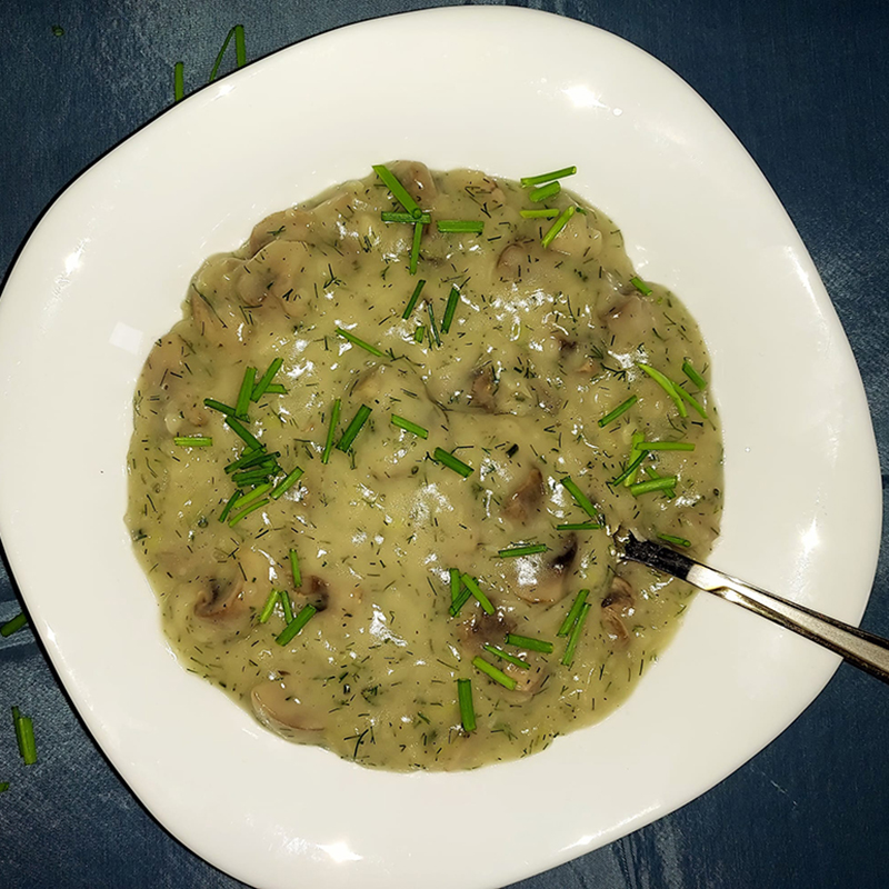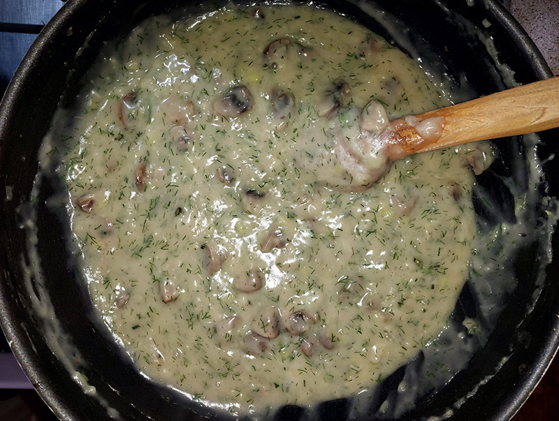 • Se adaugă ciupercile fierte și apoi mărarul tocat mărunt, se amestecă până se înglobează totul, se dă într-un clocot (aprox.5 min.).
