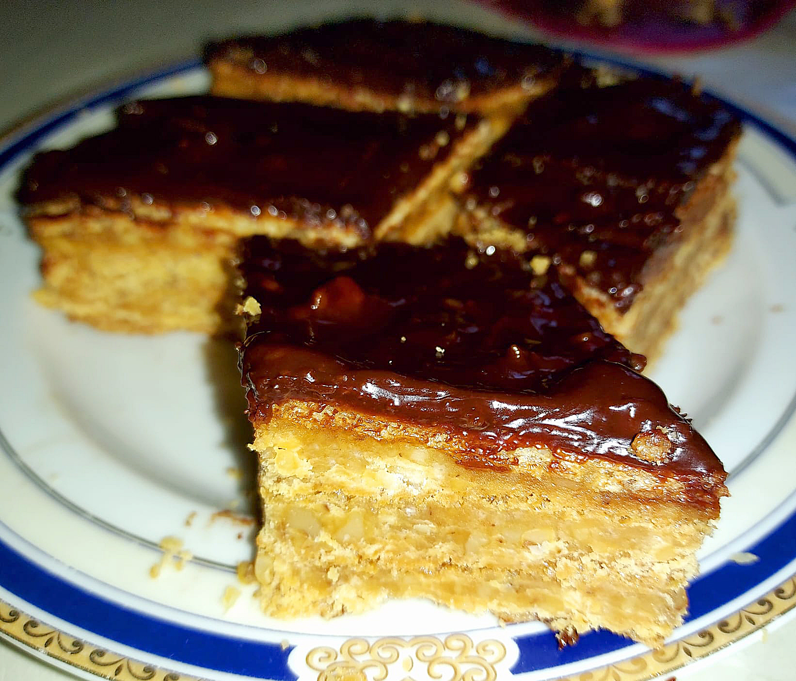 • Apoi, se întinde peste a doua foaie încă un strat de cremă caramel FIERBINTE, se adaugă a treia foaie și iar se presează uniform ( aprox. 3 min.)