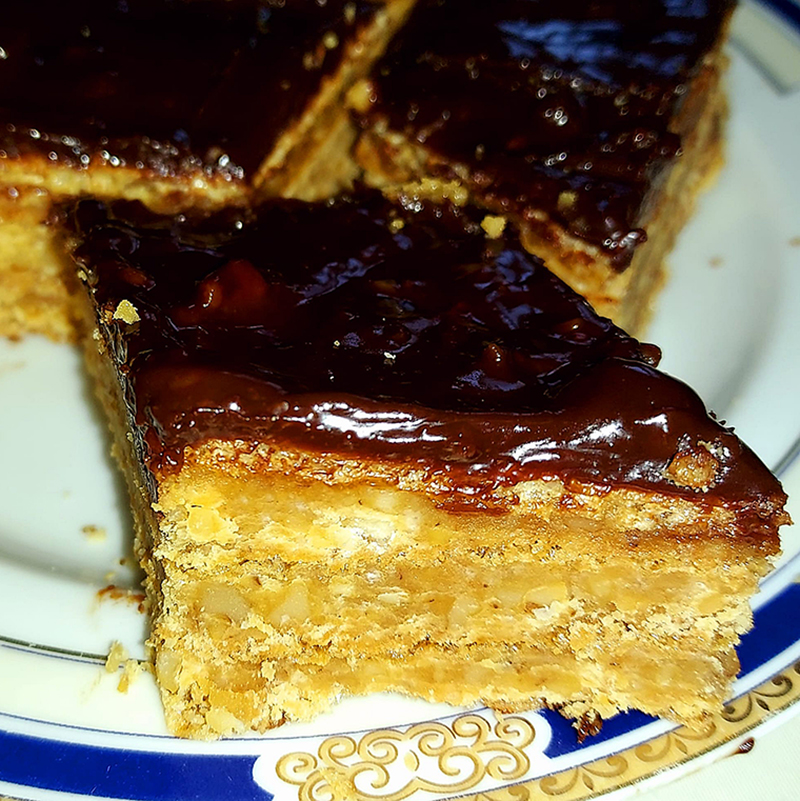 • Se amestecă 2 linguri de cremă caramel (păstrate în prealabil) cu 100 g ciocolată amăruie topită,  formându-se o glazură, care se întinde pe prăjitură (aprox. 5 min.)