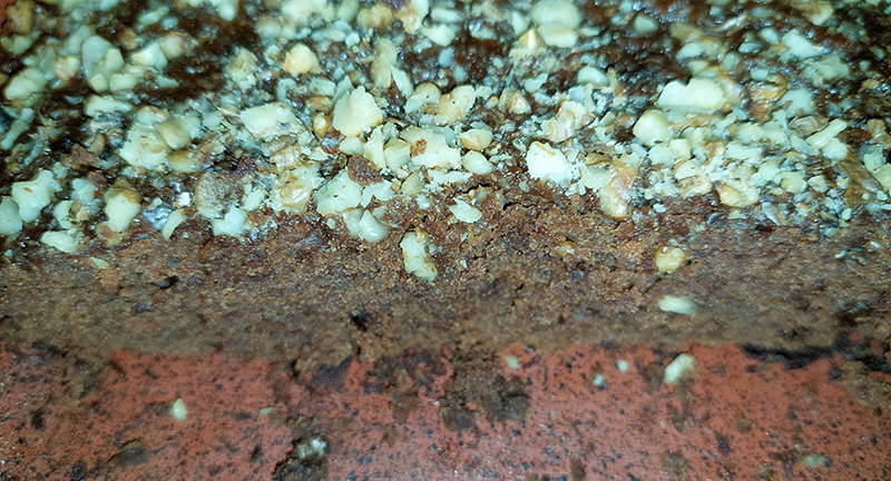 - Se pune compoziția preparată, într-o tavă de copt unsă cu puțină margarină iar deasupra se presară miezul de nucă prăjit și mărunțit (aprox. 5 min.).