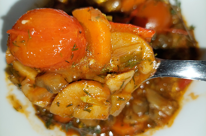 - Se călesc, separat, în 2 linguri ulei de măsline, întâi, ceapa uscată & verde, usturoiul verde pentru aproximativ 5 min, apoi, se adaugă ardeii capia, morcovul și se mai lasă aproximativ 10 min
