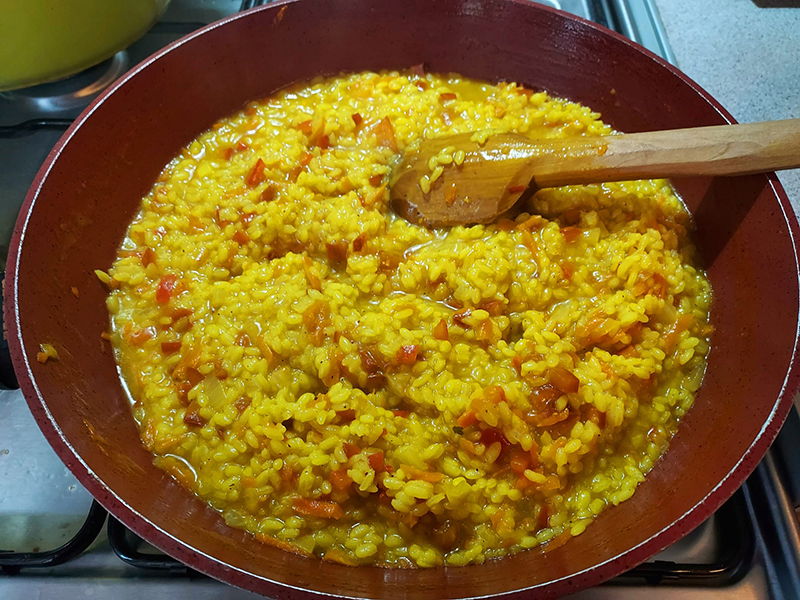 • Apoi, se adaugă orezul, 1 și 1/2 cană cu apă, se amestecă, se acoperă cu un capac și se lasă să fiarbă, pentru aproximativ 20 min (din când în când, se amestecă și se gustă).