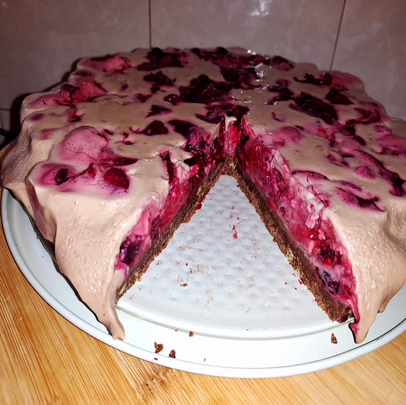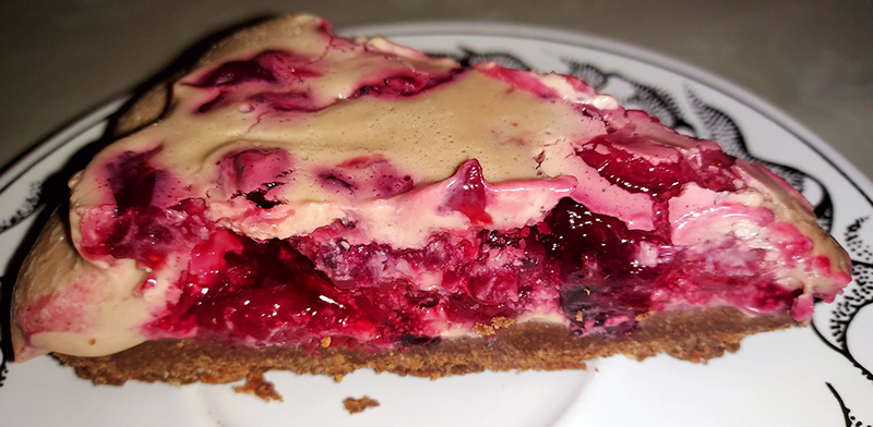 - Peste blatul de tartă se toarnă 3/4 cremă, apoi, topping-ul de fructe și în final restul de cremă.