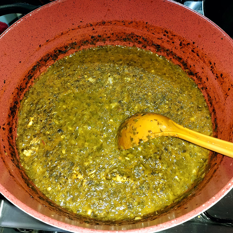 • Se adaugă sare, piper, după gust, spanacul congelat, apa, sucul de roșii & pasta de tomate, zeama de lmâie și seamestecă.