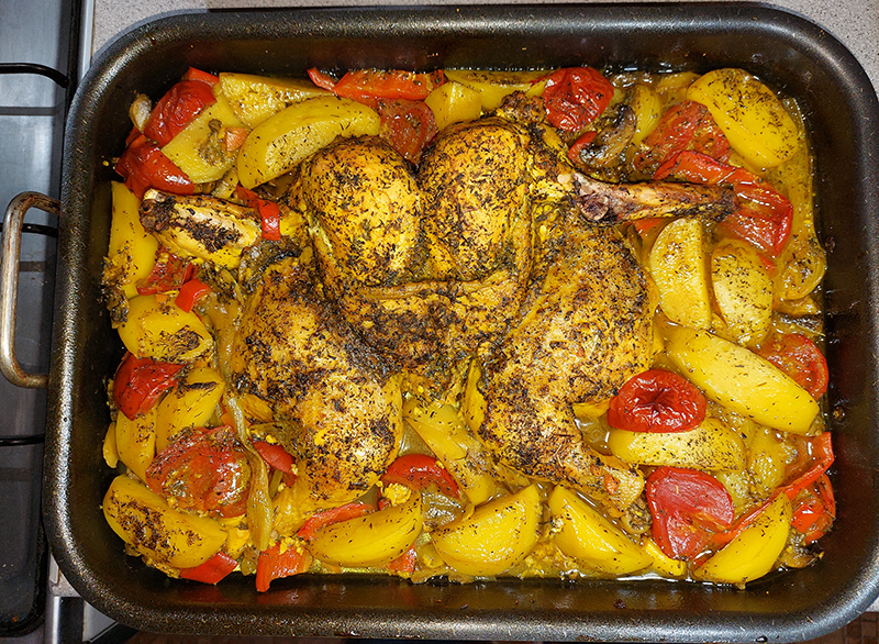 - Așezăm puiul în mijlocul vasului, iar pe lângă el vom completa spațiile libere, cu mix-ul de legume, cât mai amestecate. Roșiile le montați ultimele.