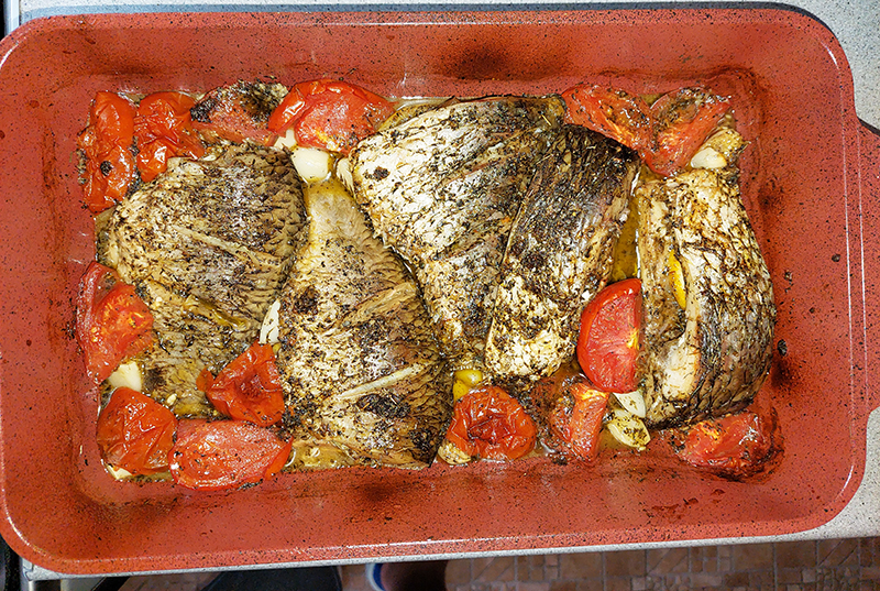 • Bucățile de pește marinat se așează într-o tavă antiaderentă. Adăugăm roșiile tăiate și cățeii de usturoi, apoi se asezonează cu sare, piper, cimbru, după gust.