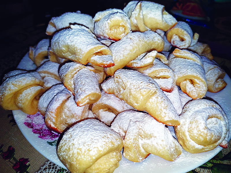 - Cornulețele formate se așează într-o tavă de copt tapetată cu hârtie de copt, apoi, se bagă la cuptor pentru aproximativ 20 min. (în funcție de puterea cuptorului).