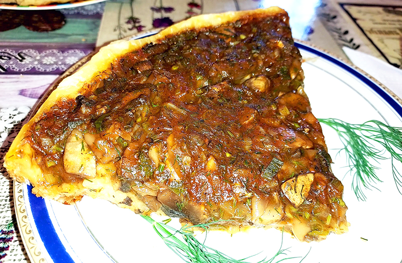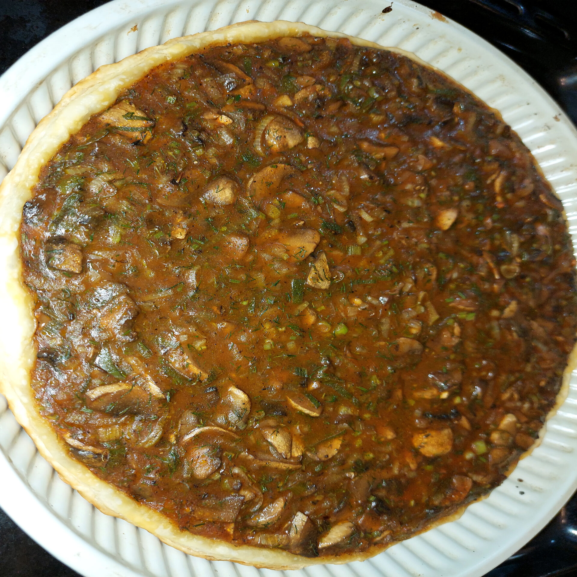 - Într-o formă de tartă se așează o foaie aluat de foietaj, care se înțeapă peste tot cu o furculiță, după care se toarnă compoziția călită de ciuperci.
