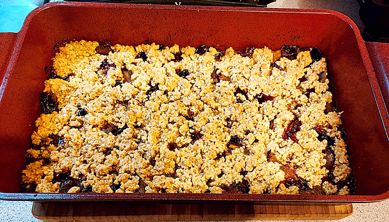- Într-o tavă de copt, unsă cu unt se așează amestecul de prune, iar deasupra se presară firimituri din aluatul sfărâmicios de fulgi de ovăz.