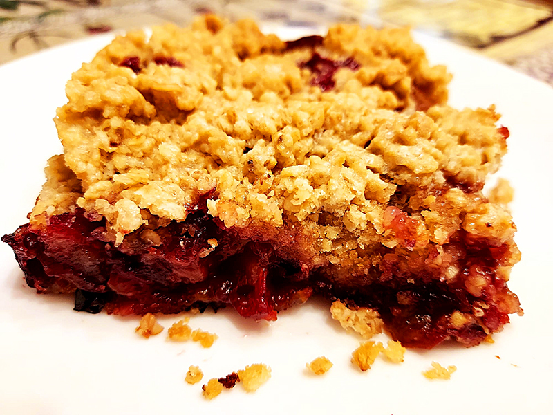 - După aceea, se prepară aluatul sfărâmicios, amestecând fulgii de ovăz cu făina, zahărul brun, untul cubulețe și esența de vanilie.
